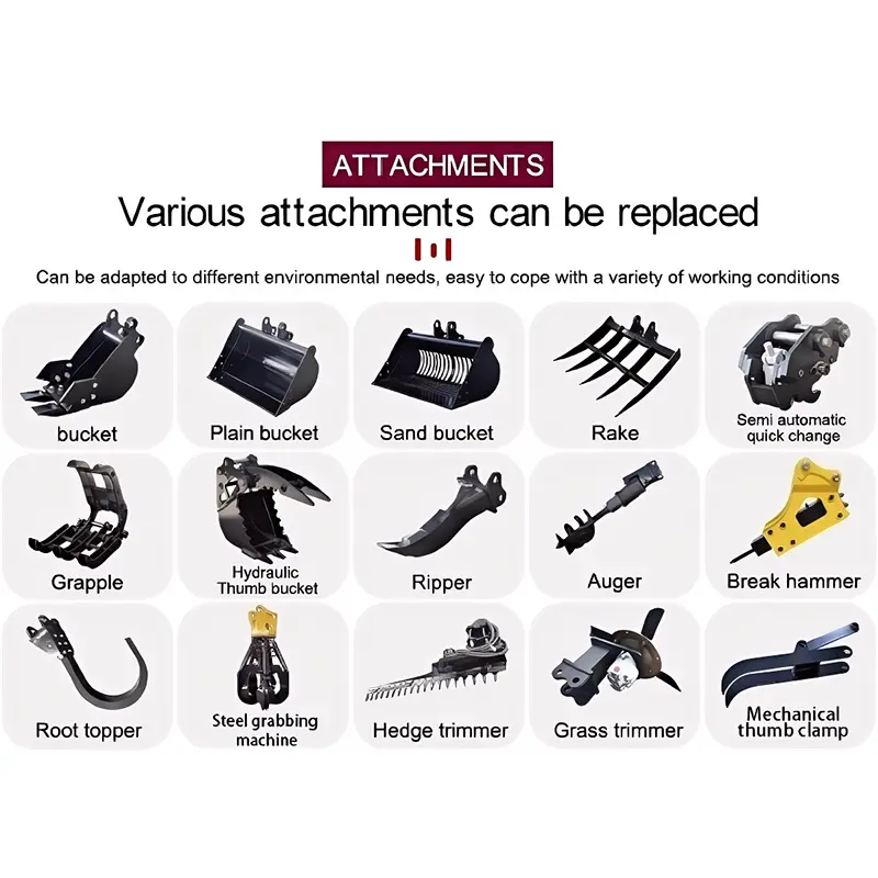 மினி அகழ்வாராய்ச்சிகளுக்கு பல்வேறு மாதிரிகளுடன் தொடர்புடைய வெவ்வேறு இணைப்புகளை நாங்கள் தயாரித்துள்ளோம். பல்வேறு பயன்பாட்டு சூழ்நிலைகளில் வெவ்வேறு பணிகளை முடிக்க பயனர்களுக்கு உதவுகிறது. குறிப்பிட்ட பணிகளை முடிக்க இலக்கு இணைப்புகளைப் பயன்படுத்தி, பல நோக்கங்களுக்காக ஒரு இயந்திரத்தை உண்மையிலேயே அடையலாம்.