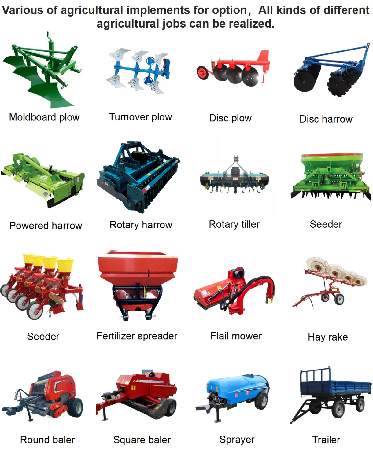 ஒரு டிராக்டரின் சக்தி, அதனுடன் இணைக்கப்படக்கூடிய விவசாய கருவிகளின் வகைகள் மற்றும் அளவுகளை நேரடியாக தீர்மானிக்கிறது. போதிய சக்தி இல்லாததால், விவசாயச் செயலாக்கச் செயல்பாடுகளின் குறைந்த செயல்திறன் ஏற்படும், மேலும் அவை சாதாரணமாக மண் செயல்பாடுகளைச் செய்ய முடியாமல் தடுக்கும்; அதிக சக்தி, மறுபுறம், ஆற்றல் விரயத்தை ஏற்படுத்தும். பொதுவாக, சிறிய டிராக்டர்கள் (15-30 குதிரைத்திறன்) சிறிய சுழலும் உழவு இயந்திரங்கள், விதைப்பு இயந்திரங்கள் போன்றவற்றுடன் இணைக்க ஏற்றது, மேலும் மலைகள் மற்றும் சமவெளிகளில் சிறிய அளவில் நடவு செய்வதற்கு ஏற்றது; நடுத்தர அளவிலான டிராக்டர்கள் (30-80 குதிரைத்திறன்) நடுத்தர அளவிலான மோல்ட்போர்டு கலப்பைகள், பரந்த-வரிசை ரோட்டரி டில்லர்கள், ஸ்ட்ரிப் பிளான்டர்கள் போன்றவற்றுடன் இணைக்கப்படலாம், மேலும் அவை சமவெளிகளில் நடுத்தர அளவிலான நடவு செய்வதற்கு ஏற்றவை; பெரிய டிராக்டர்கள் (80 குதிரைத்திறனுக்கு மேல்) பெரிய ஒருங்கிணைந்த உழவு மற்றும் சாகுபடி இயந்திரங்கள், பரந்த-வரிசை விதைகள், ஒருங்கிணைந்த அறுவடை இயந்திரங்கள் போன்றவற்றுடன் இணைக்கப்படலாம், மேலும் அவை பெரிய அளவிலான மற்றும் தீவிர நடவுகளுக்கு ஏற்றவை.